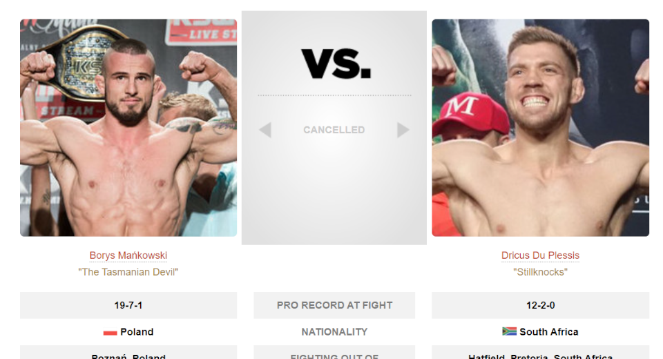 Borys Mańkowski (wówczas 19-7-1) po dotkliwej stracie pasa mistrzowskiego i ciężkiej kontuzji która uniemożliwiła mu start na KSW 44 powracać miał w marcu 2019 roku na gali KSW 47. Rywalem ”Tasmańskiego Diabła” miał być będący w bardzo zbliżonej sytuacji Dricus Du Plessis (wówczas 12-2). ”Stillknocks” który zaskoczył wszystkich demolując Soldicia, w rewanżu sam został zdemolowany po czym fani nieco w niego zwątpili. Zrobili to również oceniający ten pojedynek bukmacherzy którzy zdecydowanie faworyzowali Mańkowskiego. Bój ten zapowiadał się naprawdę zacnie, a Du Plessis miał wszystko aby sprawdzić tu sporą niespodziankę. Niestety w trakcie przygotowań uszkodził on rękę a w jego miejsce wskoczył Norman Parke…