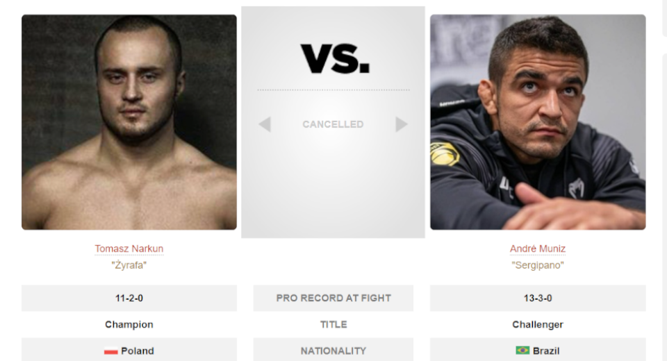 Tomasz Narkun (wówczas 11-2) po zaskakującym zrewanżowaniu się Goranowi Reljiciowi już dwie gale później powracać ma do klatki. Organizacja KSW ogłosiła, iż jego rywalem zaplanowanym na tą galę będzie świeżo podpisany Brazylijczyk Andre Muniz (wówczas 13-3). Tak to właśnie ten Muniz który błyskawicznie poddał zarówno Fabińskiego jak i legendarnego Souze. Patrząc względem czasu naprawdę stanowiłby on bardzo duże zagrożenie dla ”Żyrafy” i mógłby zaskoczyć właśnie w jego koronnej płaszczyźnie. Co tym razem? Kontuzja łokcia, i zmiana na dużo gorszego krajanina Muniza którego Narkun błyskawicznie znokautował…